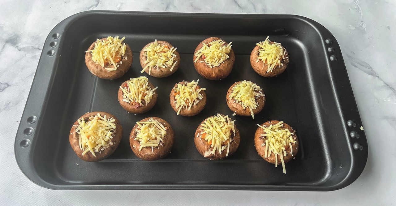- Vul alle champignons met het mengsel en rasp er daarna wat oude kaas over.
