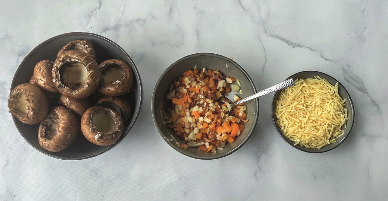 - Maak de champignons schoon, snijd de onderkant van de steel af en hol de champignons een beetje uit. De inhoud kun je eventueel fijnsnijden en zo meteen door de vulling doen.
