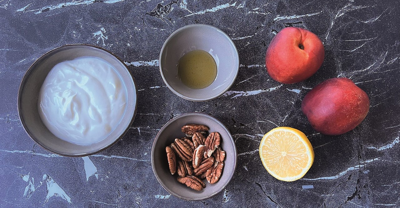 - Leg de nectarines op een bord en verdeel de yoghurt erover, in het kuiltje van de pit.