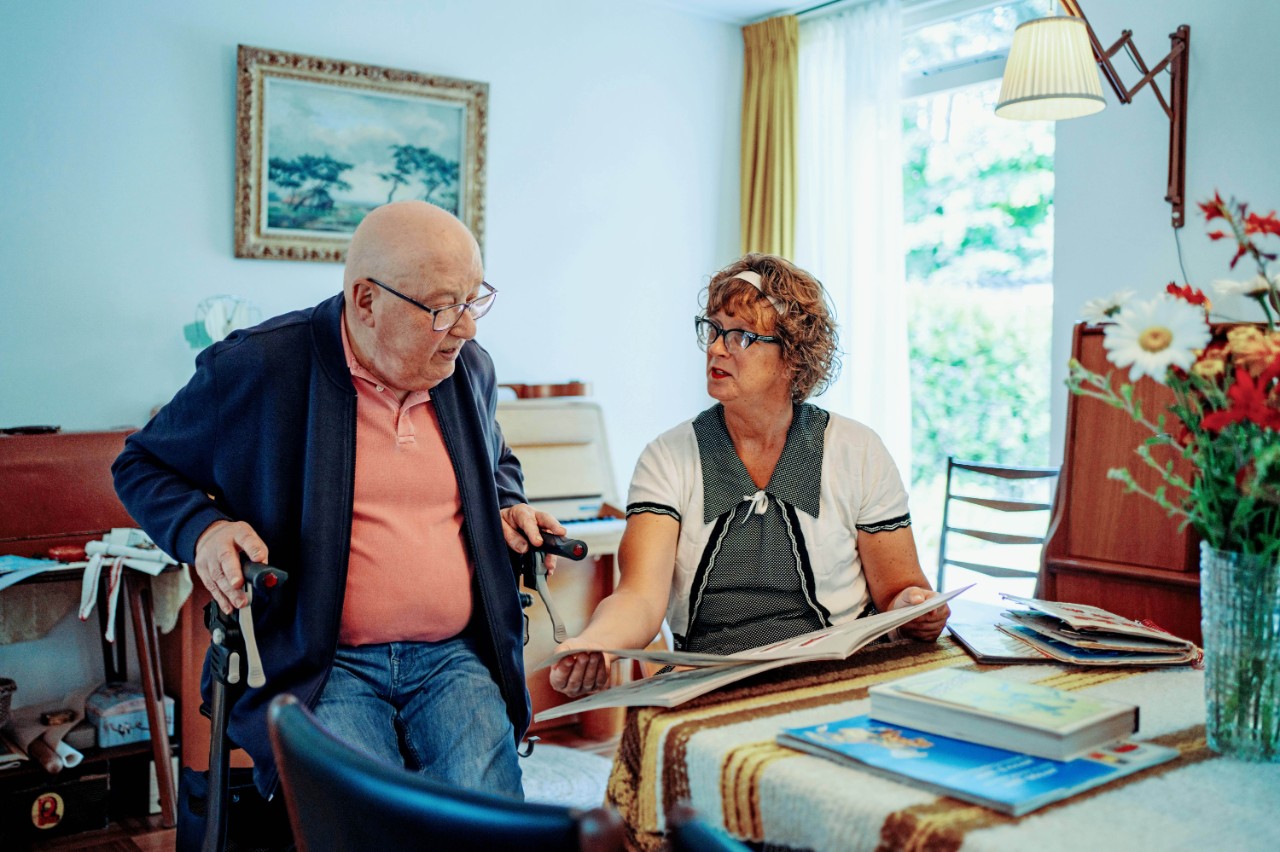 ‘Stimuleer gesprekken met je cliënt met oude muziek, gerechten en spullen van vroeger. Of laat ze eens helpen in de keuken, bijvoorbeeld met groente snijden of gehaktballetjes draaien. Wij laten bezoekers zoveel mogelijk zelf doen: de taart aansnijden en suiker in de koffie doen. Soms schiet de deksel van het suikerpotje eraf en vliegt alles over tafel, maar dat levert juist een leuk gesprek op. Als je alles uit handen neemt, doen mensen steeds minder zelf. Terwijl dat juist het zelfvertrouwen vergroot. Mensen gaan met een glimlach naar huis. Aan het eind krijg ik vaak een bedankje en een hand op mijn schouder. Het is heel bijzonder om op deze manier iets voor iemand te betekenen.’