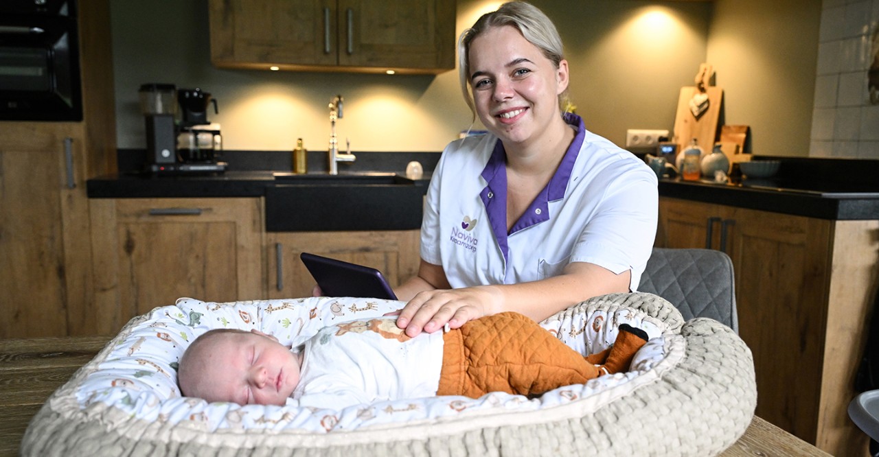 ‘Dat hangt af van hoe druk het is, in hoeverre vraag en aanbod in balans is: hoeveel kinderen worden er geboren en hoeveel kraamverzorgenden zijn er die periode beschikbaar? In het uiterste geval “dubbelen” we. Dan doe je twee gezinnen op één dag: de een ’s ochtends, de ander ’s middags. Zo zorgen we ervoor dat niemand zonder zorg komt te zitten. Dat zien we als onze zorgplicht. Vanwege de druk op de kraamzorg heeft Naviva ook een app ontwikkeld waar ouders terechtkunnen met vragen. In de app vind je veel instructiefilmpjes en informatie. Ook bieden we e-consulten aan: ouders kunnen beeldbellen met een kraamverzorgende als ze ergens hulp bij nodig hebben.’