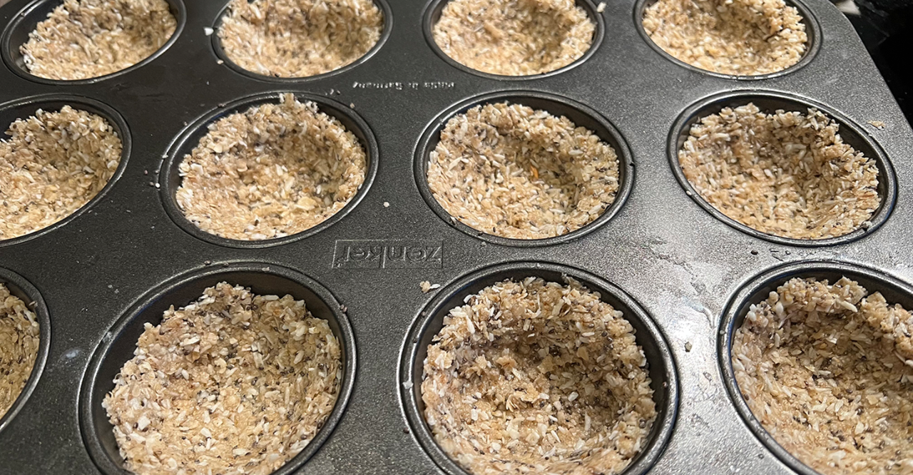 - Verdeel het mengsel over de muffinvormpjes en druk het tegen de zijkant van de vormpjes, zodat ze de vorm van een cup krijgen.