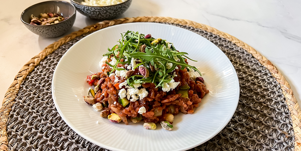 - Serveer de risotto op een bord en garneer met de feta, pistachenootjes en een plukje rucola.
