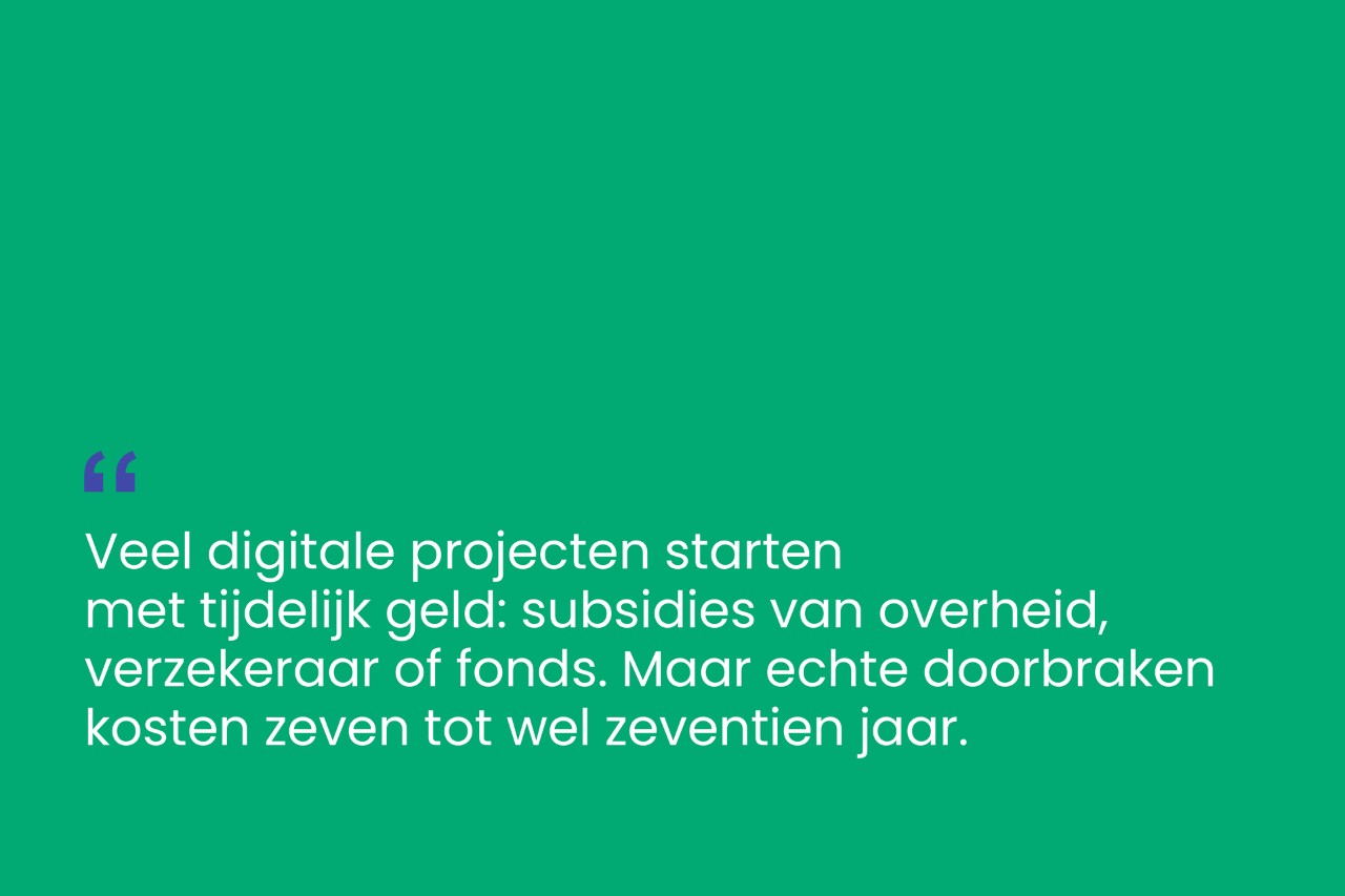 De grootste valkuil bij digitalisering? Dat is ongeduld, zegt Engelen. ‘Veel digitale projecten starten met tijdelijk geld: subsidies van overheid, verzekeraar of fonds. Men gaat ervan uit dat het project binnen anderhalf jaar rond is. Maar echte doorbraken kosten zeven tot wel zeventien jaar.’